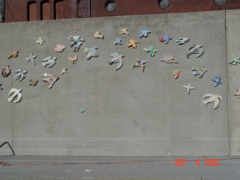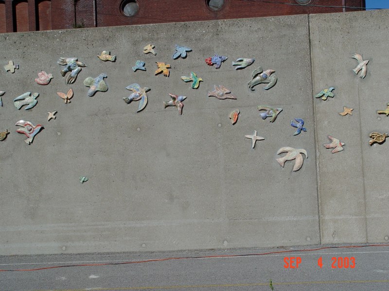 The mural ends with the migration of birds. Kids Club House a very special organization that assists children that are going through the grieving process agreed to participate with me on this project. I asked if the children would want to make birds for the last portion of the mural. The collaboration was with social workers who added a special touch to this project. The Community out reach collaboration with children gave this project a memorial component that was extraordinary. Public art can heal a community and give joy enough to motive us all towards a better place to live.