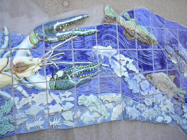 This mural was one project that I felt we were able to involve community out-reach. The educational component was to teach children about endangered species. The Fish flow along and transition into the Reeds and night section. We visited schools taking clay slabs and found objects. We invited kids to make fish shapes with textures made from cast offs. Anything we could think of even the bottom of shoes became beautiful patterns on the fish. When visiting the wall you will find numerous textures from kitchen tools, shoes, jewelry, to auto parts and even toys. (click on the image for more scenes of “The Mississippi River”).