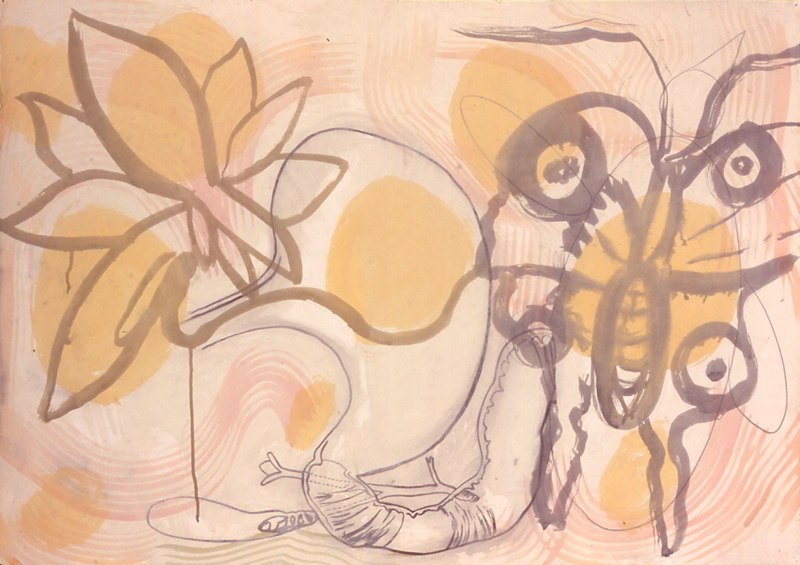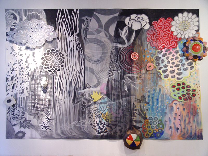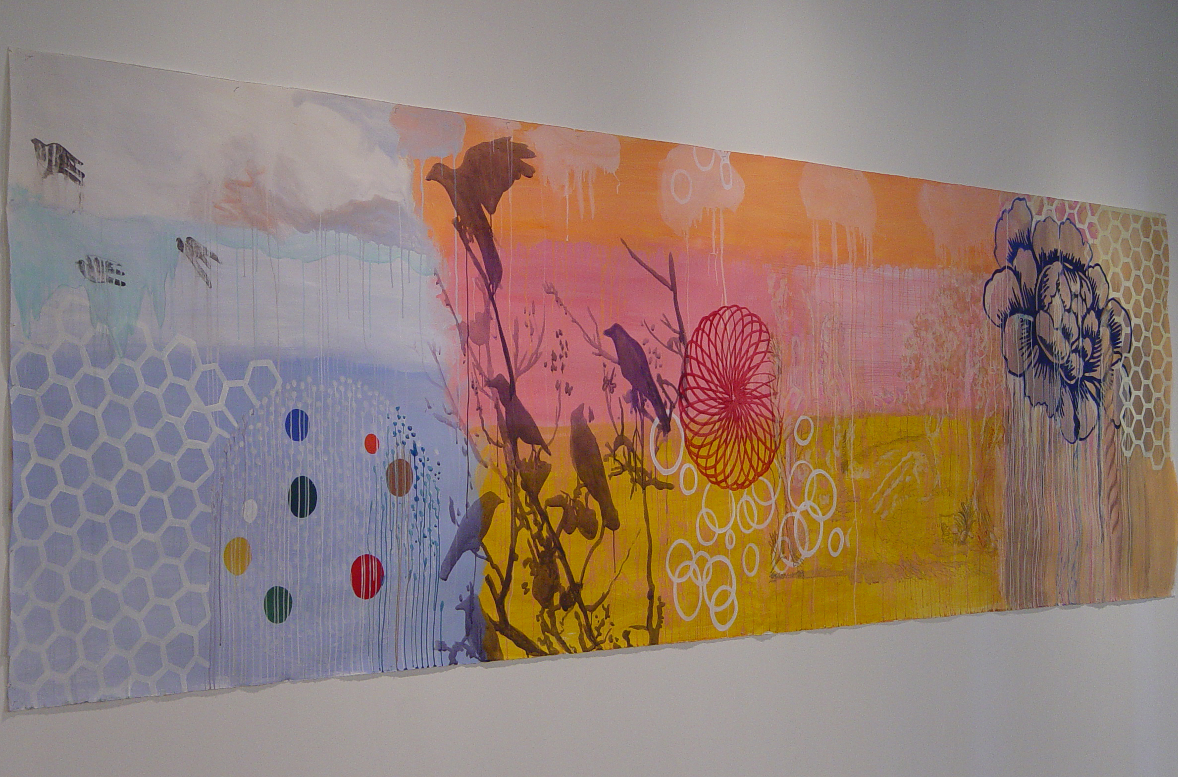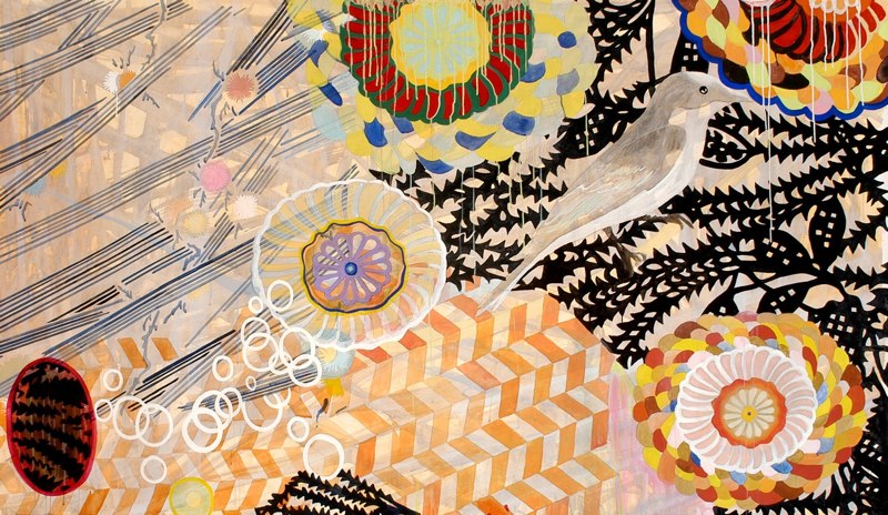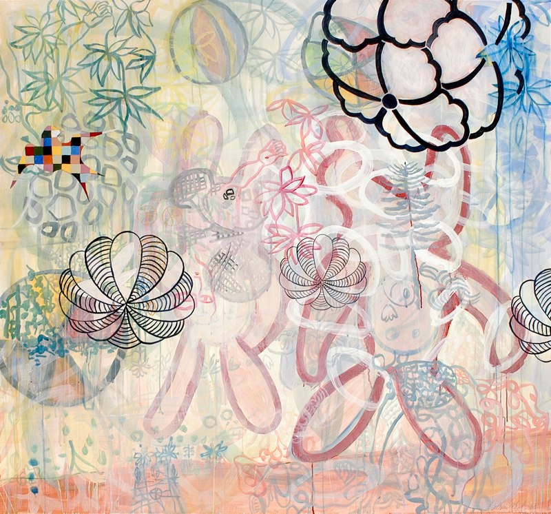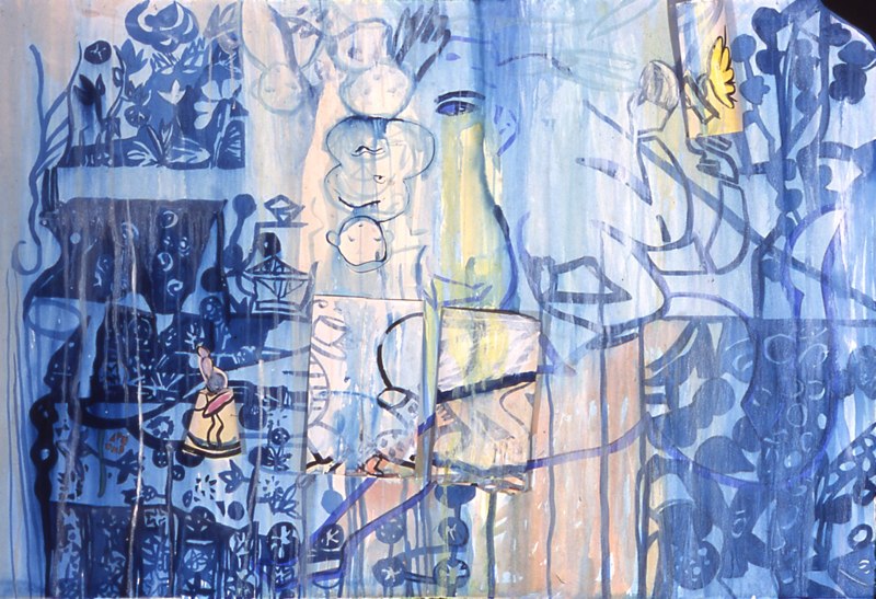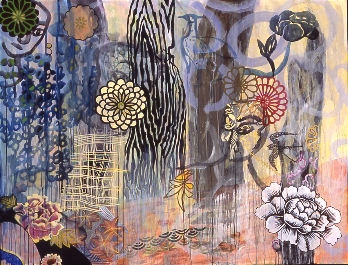 There are visually floating patterned decorative elements and various floriated forms with repeated stylized chrysanthemum-like florets, while that particular flower is itself, a culturally fluid symbol evoking lamentation, death, royalty, or happiness. The viewer is forced to create a relational dialogue within the work itself. Playfulness with meaning is apparent in her work with layers of information erased by disguising previous layers of painted glazes. For Example Steven Biko and the spy II painting is about bringing to light the truth that is being concealed in history and the revealing of truth. The painting reflects this by the style of erasing and adding more through layering of images one on top of the other which becomes abstracted as it progresses. A new kind of seeing then becomes the hope for clarity. “Her work has been associated with modern painters such as Philip Taaffe and Terry Winters biomorphic paintings. “ – Jeff Hughes