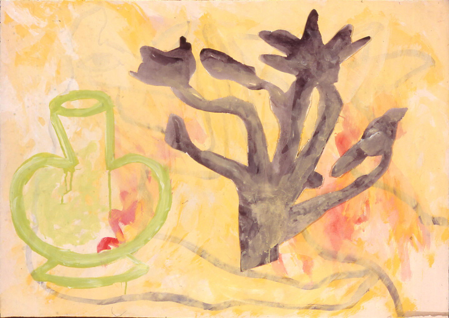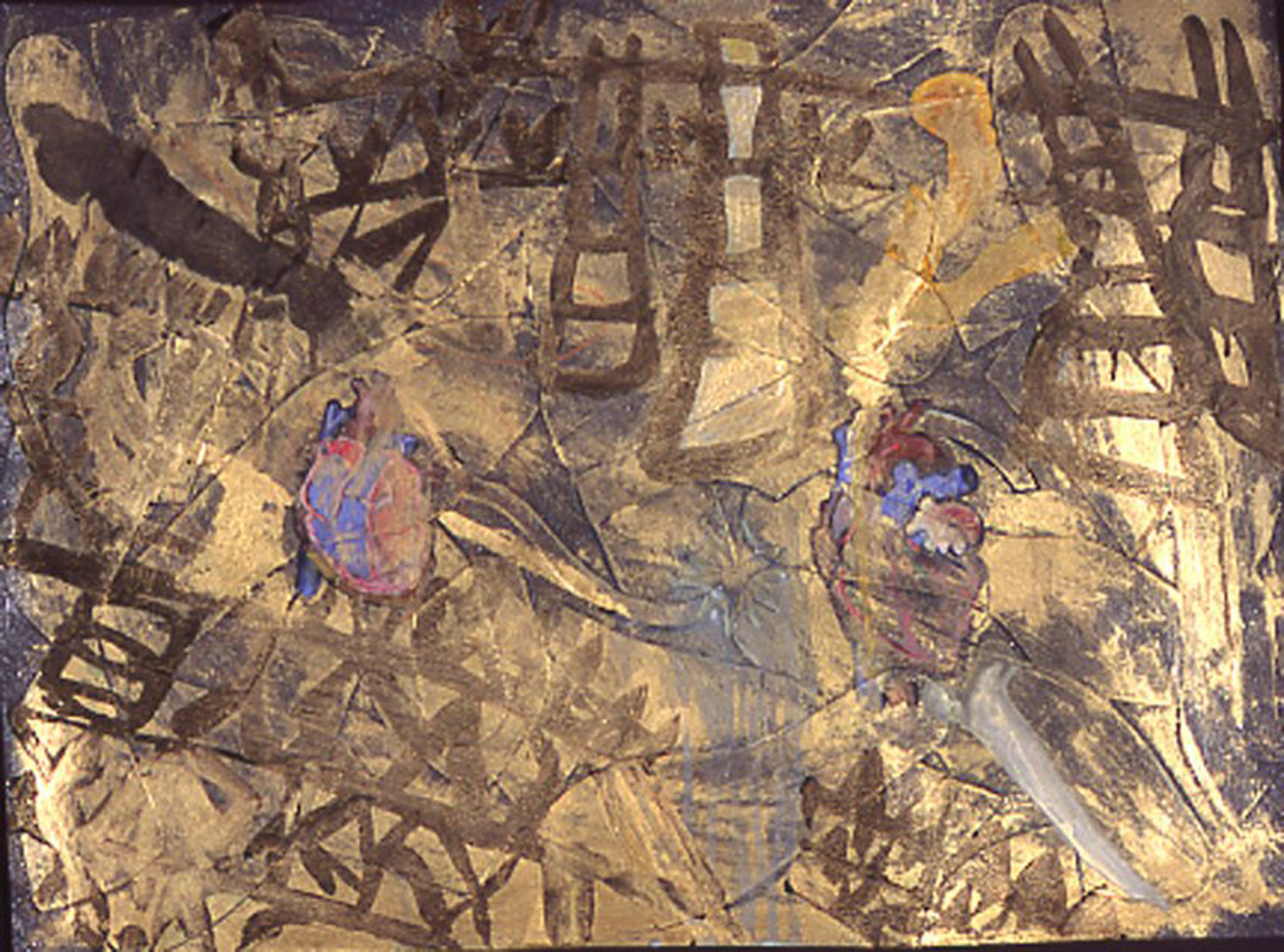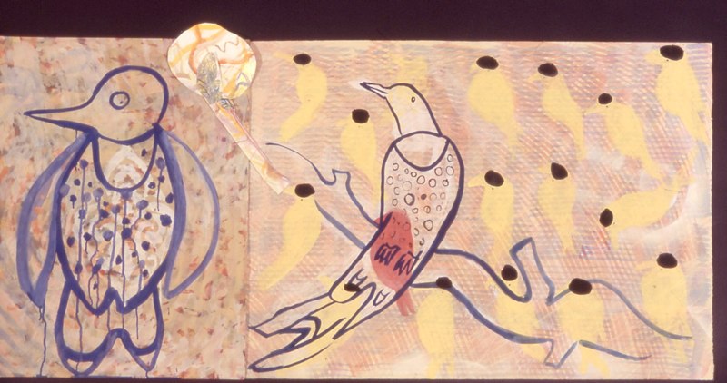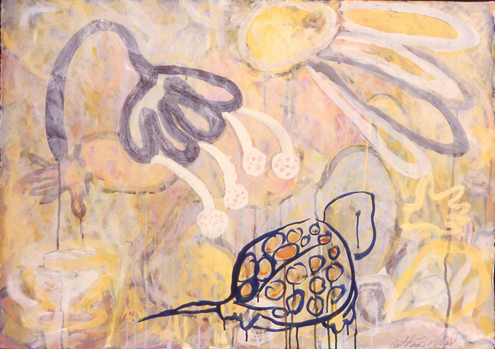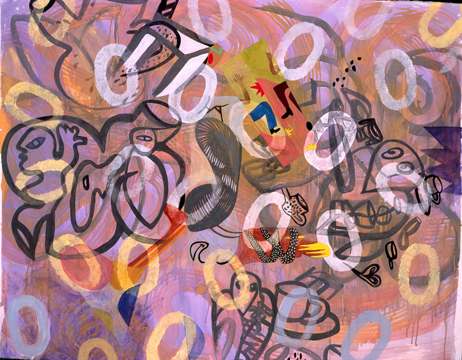 There are visually floating patterned decorative elements and various floriated forms with repeated stylized chrysanthemum-like florets, while that particular flower is itself, a culturally fluid symbol evoking lamentation, death, royalty, or happiness. The viewer is forced to create a relational dialogue within the work itself. Playfulness with meaning is apparent in her work with layers of information erased by disguising previous layers of painted glazes. For Example Steven Biko and the spy II painting is about bringing to light the truth that is being concealed in history and the revealing of truth. The painting reflects this by the style of erasing and adding more through layering of images one on top of the other which becomes abstracted as it progresses. A new kind of seeing then becomes the hope for clarity. “Her work has been associated with modern painters such as Philip Taaffe and Terry Winters biomorphic paintings. “ – Jeff Hughes